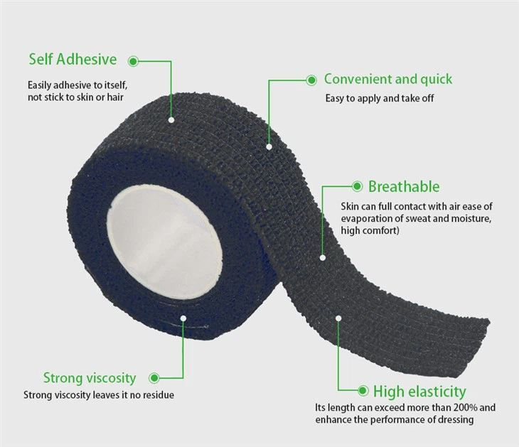 La fasciatura appiccicosa nera è realizzata in tessuto elastico di alta qualità, rivestito con uno strato di particelle di polimero naturale su entrambi i lati del tessuto elastico ed elaborata da un determinato processo. Il prodotto nero di bendaggio adesivo non si attacca a capelli, pelle, vestiti e non cade in caso di sudore. I bendaggi elastici autoadesivi dovrebbero avere lucentezza uniforme, incisioni pulite, nessun odore, macchie e bara esposte; La forza di rottura non dovrebbe essere inferiore a 10n/cm; L'autodesività non dovrebbe essere inferiore a 3N/cm; L'allungamento non dovrebbe essere inferiore al 50%; Nessuna irritazione della pelle. Il prodotto è realizzato con un panno di cotone puro rivestito con adesivo medico sensibile alla pressione medica o lattice naturale, tessuto non tessuto, toppa di kinesio, stoffa elastica, garza di sgrassamento medico, tessuto elastico non tessuto e materiali compositi in gomma naturale. È anche un prodotto ideale per la vestimento di pazienti in ortopedia, chirurgia generale, ortopedia e malattie vascolari.