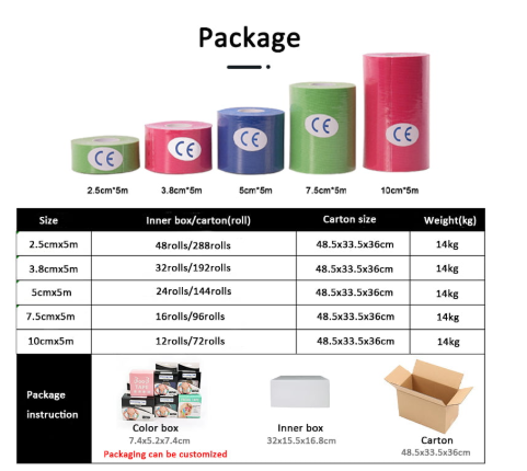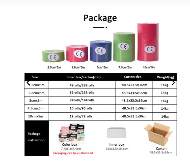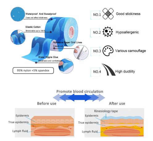 1.Camo Kinesiology La nastro è impermeabile, elastico, traspirante e adatto alla pelle. Può alleviare i problemi di gonfiore e aiutare la circolazione linfatica; È adatto a tutte le parti del corpo, applicabile a sport, terapia fisica, perdita di peso e altri scenari