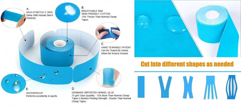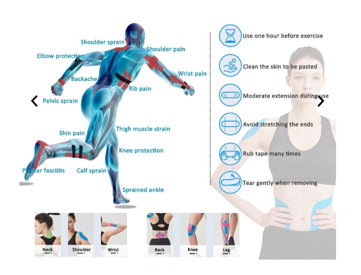 2. Il nastro di kinesiologia CAMO pre-taglio può essere utilizzato per proteggere le articolazioni, i muscoli e la fascia e alleviare il dolore; riduce l'impatto su articolazioni e tendini, migliora la circolazione sanguigna e allevia la tensione muscolare; Il nastro di kinesiologia CAMO aiuta nella correzione di deformità, contratture dei tendini, lesioni acute e croniche del tendine e terapia di recupero muscolare.